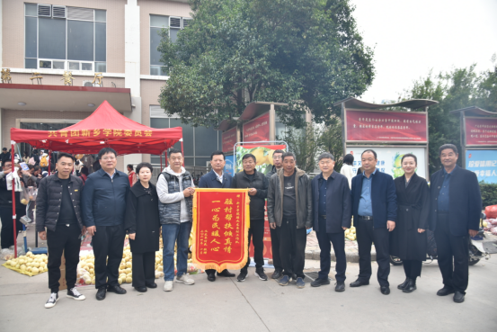 参加展销的农户非常感谢学校帮扶,成功解决了销售难的问题,许多志愿者服务队员提供了热心帮助,还暖心地送来了盒饭。随后雪桃种植户将“驻村帮扶倾真情,一心为民暖人心”的锦旗送到学校领导手里,激动地说“感谢工作队给我们提供从种植到销售的全方位服务,邀请农技专家到田间地头实地指导,提供从选种建园到嫁接果苗,防病虫、促花保果、套果袋、施肥灌溉、生态种植等全套田间管理技术”。满载全体村民谢意的锦旗,体现了村民对驻村帮扶工作的充分肯定。