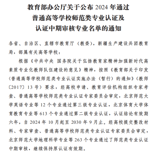 10月21日,教育部办公厅发布了《关于公布2024年通过普通高等学校师范类专业认证及认证中期审核专业名单的通知》(教师厅函〔2024〕20号),贝博官网汉语言文学、物理学专业顺利通过教育部师范类专业第二级认证,认证结论有效期六年。化学专业经提交整改材料、专家审查、普通高等学校师范类专业认证专家委员会审定通过了师范类专业认证中期审核。