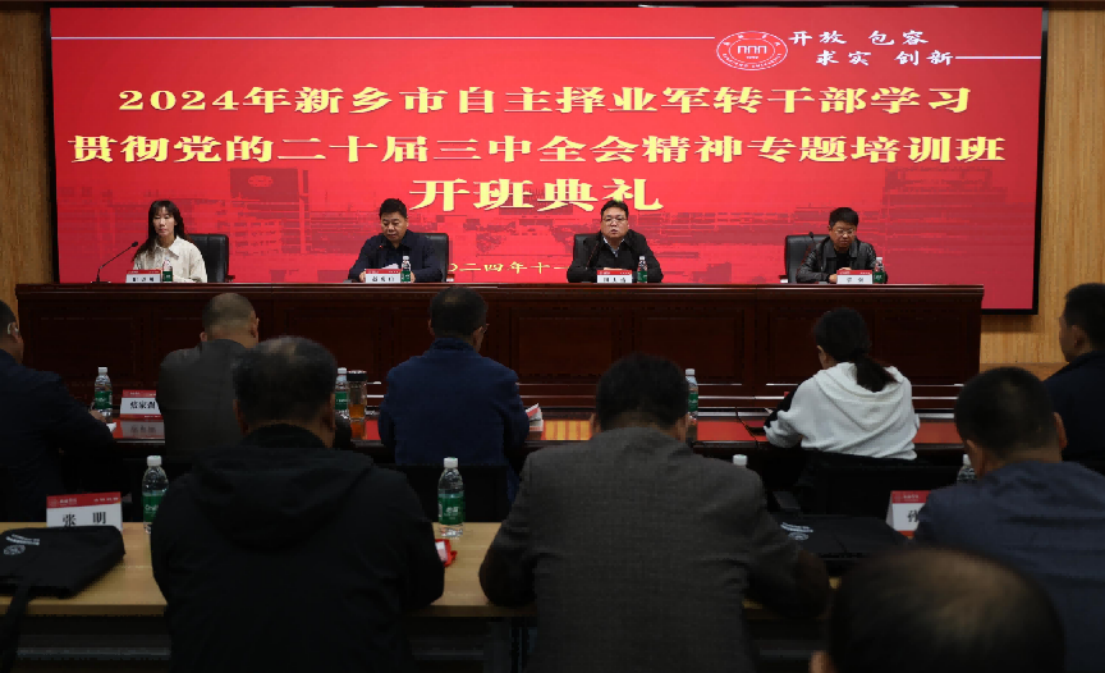 为深入学习贯彻习近平新时代中国特色社会主义思想和党的二十届三中全会精神,强化退役军人思想政治引领,11月4日上午,2024年新乡市自主择业军转干部学习贯彻党的二十届三中全会精神专题培训班在贝博官网开班。新乡市退役军人事务局副局长赵虎山、自主择业军队转业干部服务中心主任郭强、BB贝博艾弗森官方网站继续教育学院院长田大治、副院长田贝贝出席开班典礼,33名自主择业军转干部参加培训。